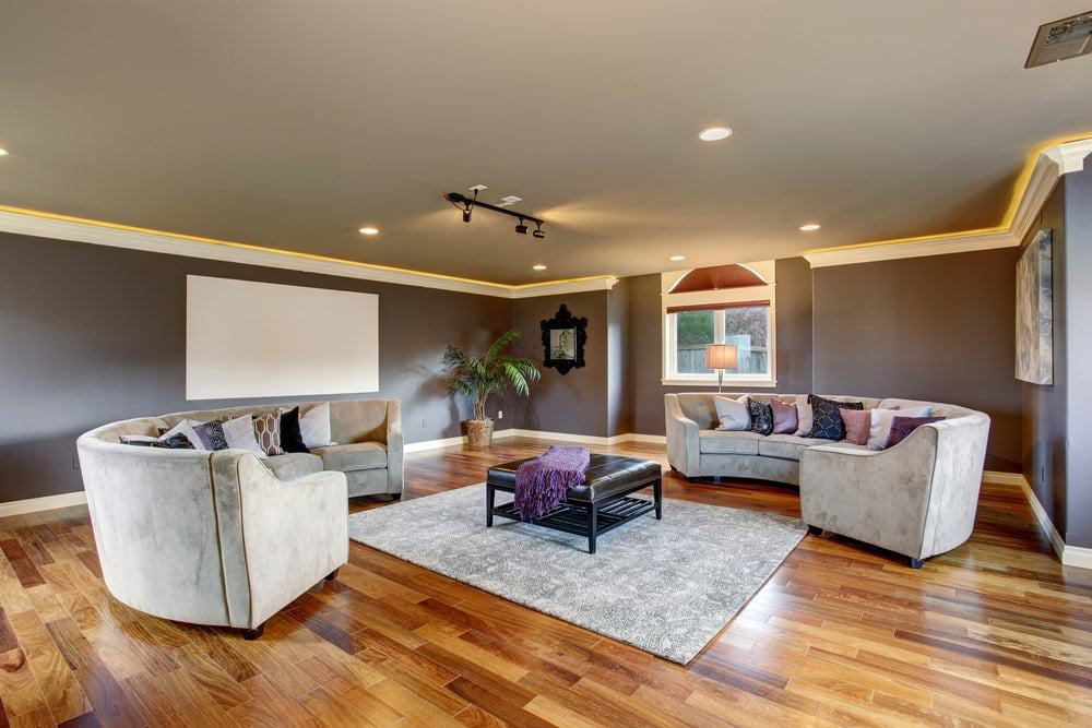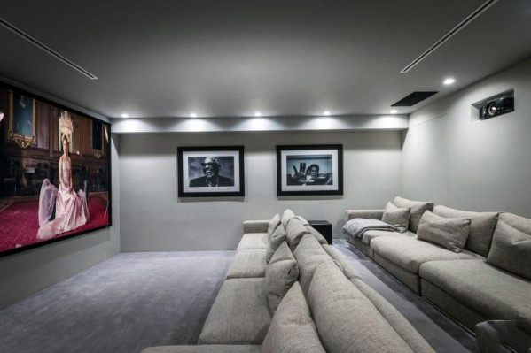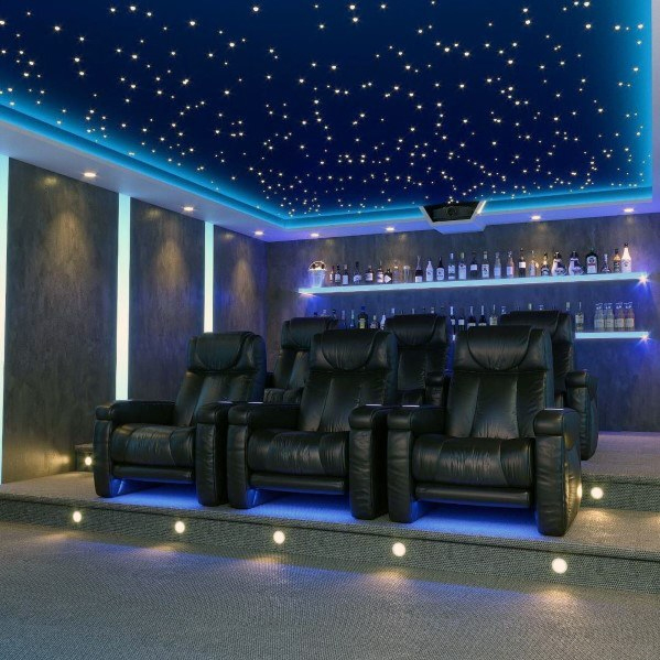 For a truly cinematic atmosphere, built-in LEDs underneath your seating adds a cool and modern touch. In addition, the subdued lighting can be functional, as it allows for some light to see without abrading the cinematic feel. LED-lit cup holders are also a great way to prevent the kids from missing the cup holder in the dark during a movie and interrupting the whole situation with spilled soda.