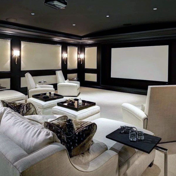 A combination of couches, ottomans, and armchairs can ensure both maximum comfort and capacity in your home cinema without having to install risers and arrange your home theater furniture in row configurations.