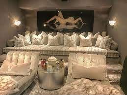 Living in L.A’s lap of luxury, Khloe K recently hosted a tour of her impressive Spanish style mansion. Her beautiful home theater does not disappoint. The media room features a variety of rich velvet textures in neutral tones. We love the center tables full of snacks and the reclining seating.