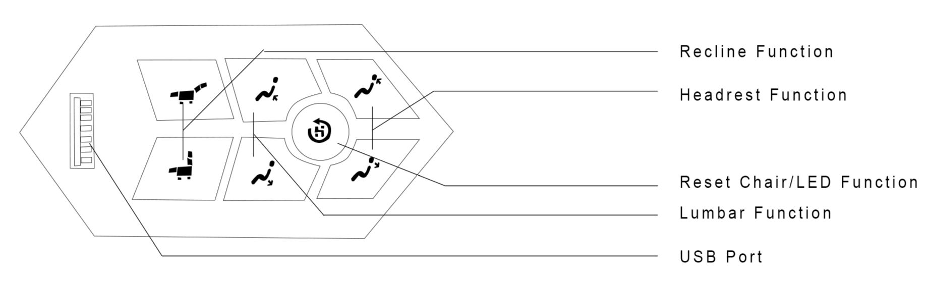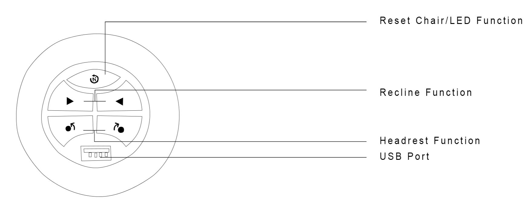 Resetting Features: If you press and hold the reset button the chair will return to its standard position (not reclined, lumbar in standard position, headrest in default position).